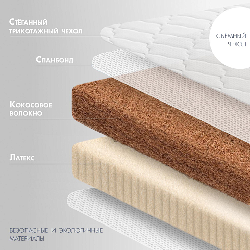 Детский матрас Nuovita Latice. Максимальная нагрузка на матрас 30 кг. Состав наполнителя: латекс 3 см + кокос 6 см + спанбонд. Жесткость матраса "средняя". Чехол матраса съёмный, выполнен из стеганного трикотажного полотна.