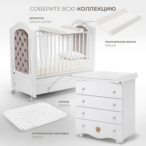 Покупатели могут выбрать матрасик-накладку белого или бежевого цвета. Изделия украшены рисунком, который соответствует одной из коллекций детской мебели Nuovita. Любой из очаровательных принтов, которые являются фирменным знаком бренда, понравится малышу и поможет создать в детской радостное настроение.