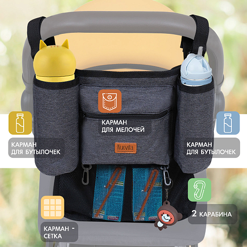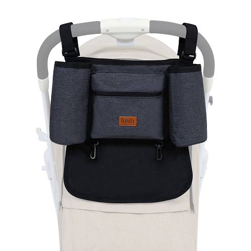 Органайзер Pratico для детской коляски NUOVITA  имеет 2 функциональных кармана с застежкой - молнией и липучкой, 2 держателя для бутылочек, 2 пластиковых крючка-вешалки. Универсальный и функциональный. Легко крепится на коляску и снимается при необходимости. Просто чистится. Регулируемые ремни с застежками. Подходит для большинства колясок. Удобен, практичен - все нужные мелочи будут всегда под рукой.