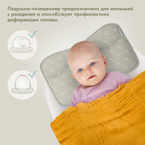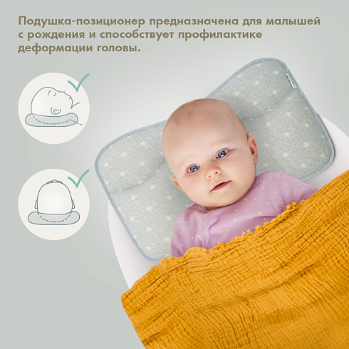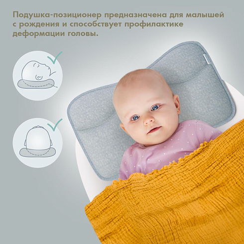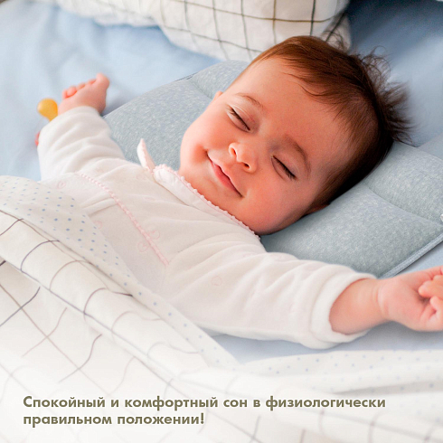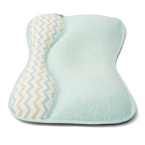 Подушка предназначена для малышей первого года жизни. Форма изделия разработана с учетом физиологии младенца и полностью соответствует особенностям его головы и позвоночника. В средней части имеется углубление, которое снижает нагрузку на шейные позвонки, а утолщения в виде валиков по краям помогают сохранить анатомически правильное положение головы.