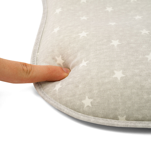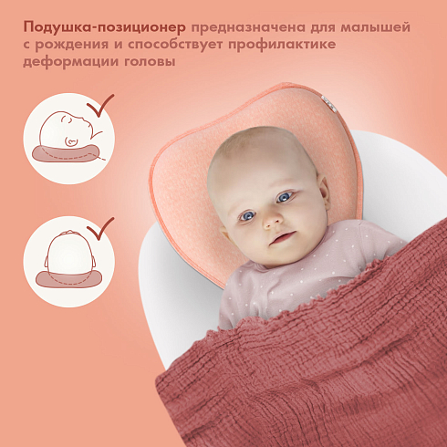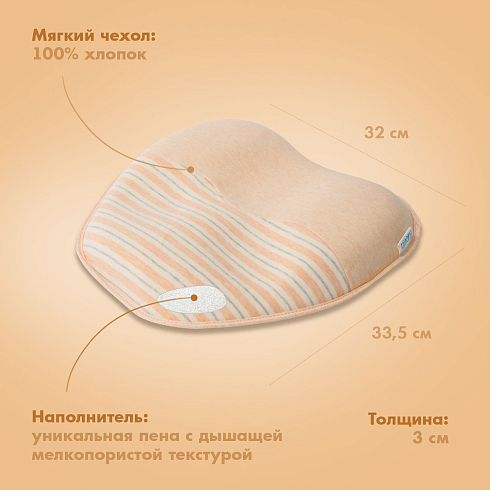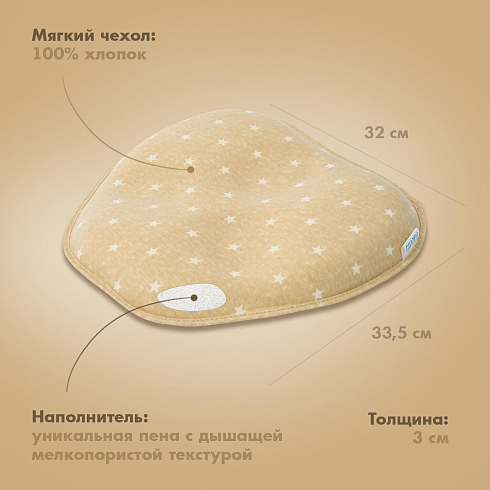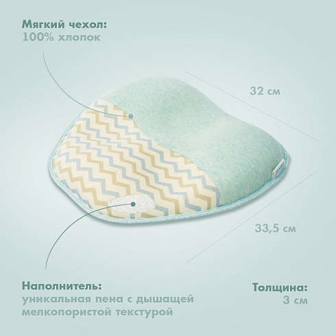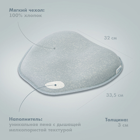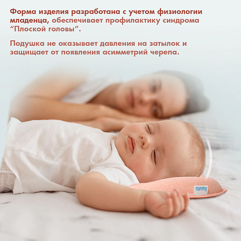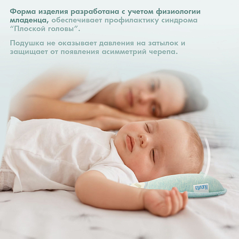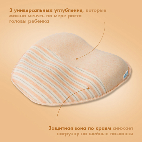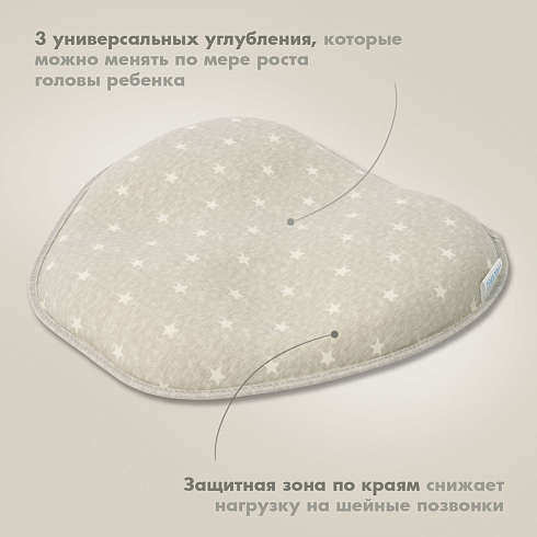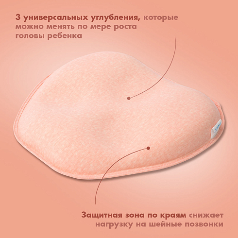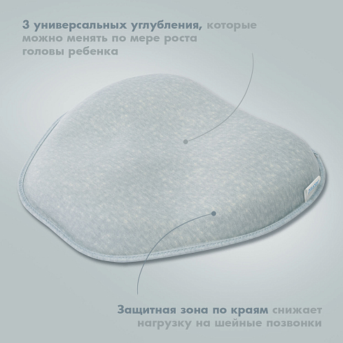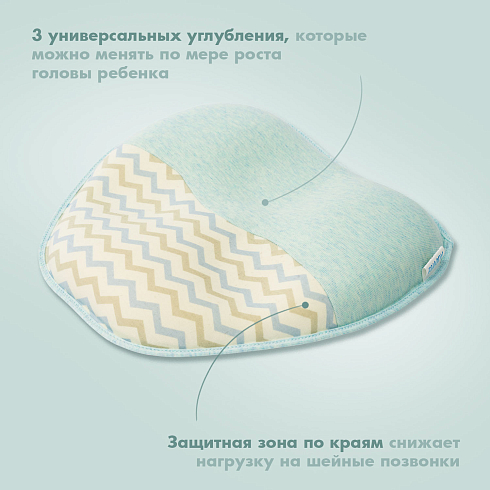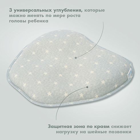 Подушка может использоваться с самого рождения и до достижения малышом полутора лет. Ее форма универсальна — одно изделие имеет 3 углубления для головы, отличающиеся по размеру, которые можно менять по мере по мере роста детской головки. Применение подушки способствует формированию анатомически правильной головы, защитная зона по краям снижает нагрузку на шейные позвонки. Благодаря этому уменьшается давление на сосуды, отвечающие за кровоснабжение мозга, и ребенок спит дольше и крепче.